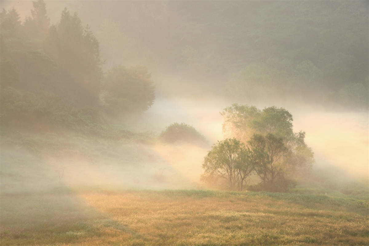 왕버들이 자라고 있는 저수지의 아침 운해