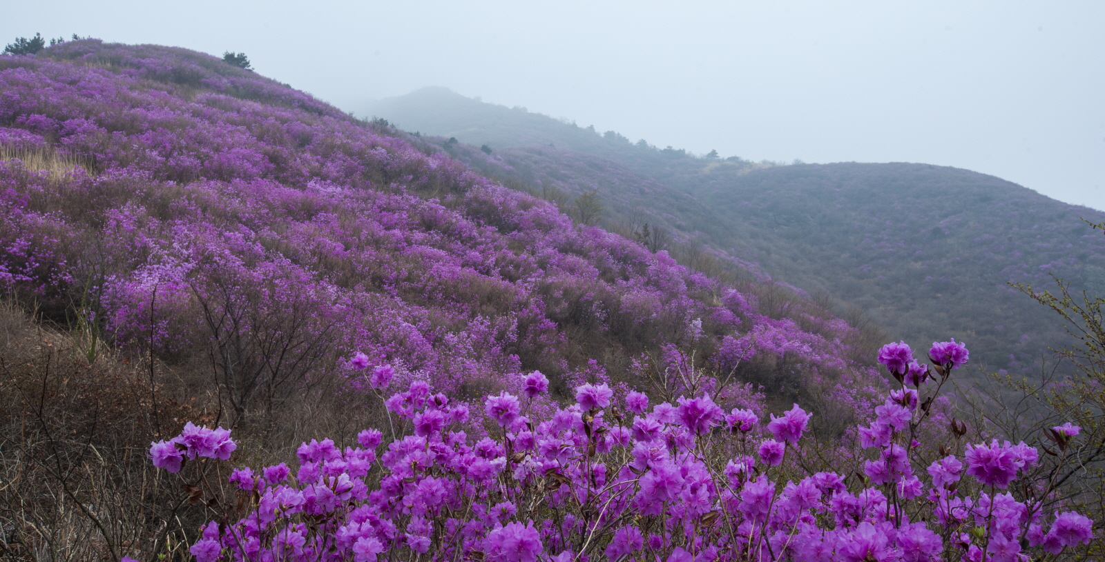 안개 자욱한 영취산 진달래입니다.
