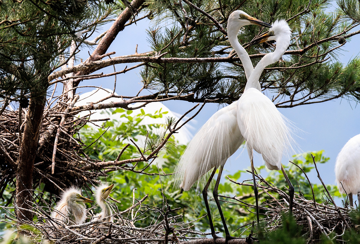 새끼를 지키던 암백로는 먹이를 잡아온 숫백로를 보며 고생하였다는 듯이 사랑을 표현합니다.