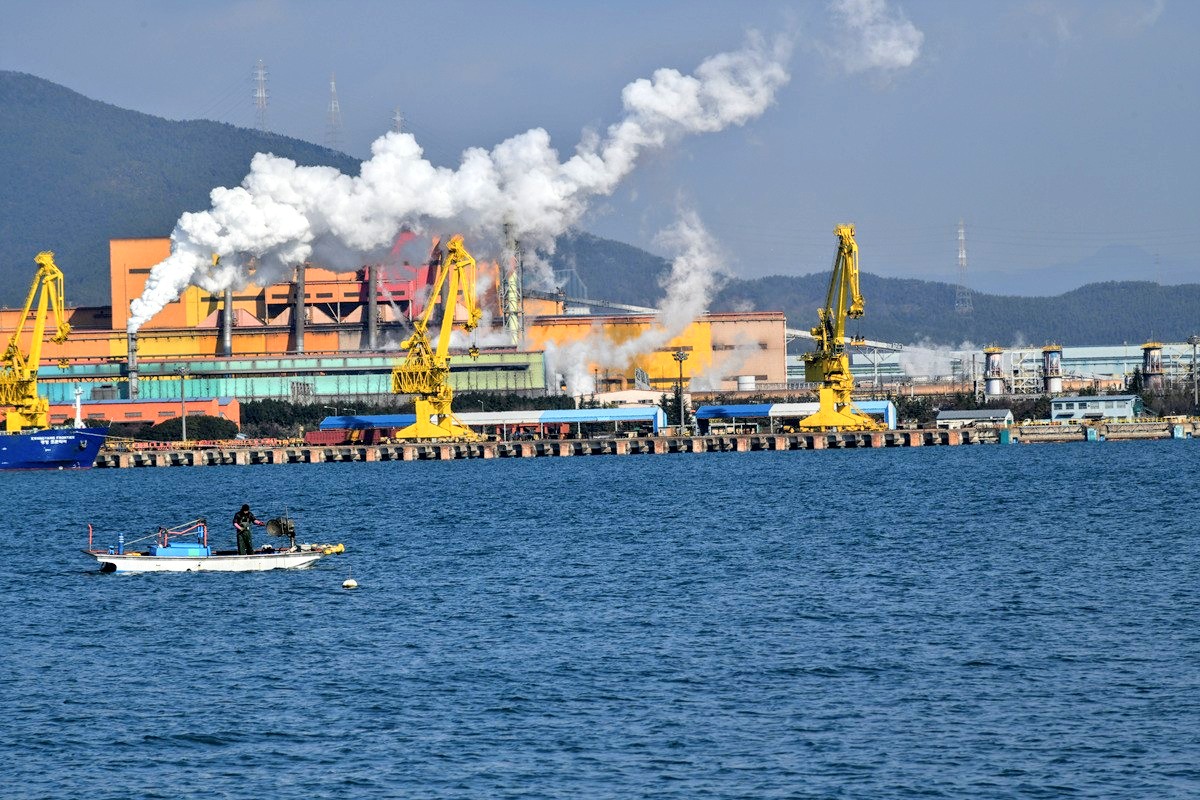 묘도에서 제품부두의 예쁜 수증기와 두척의 배가 청명한 겨울바다를