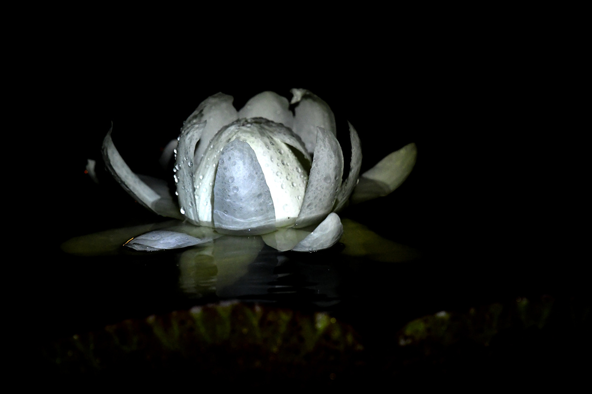 어제 저녁 내린 폭우로 인해 물 속에서 대관식을 치른 빅토리아 연꽃입니다.
