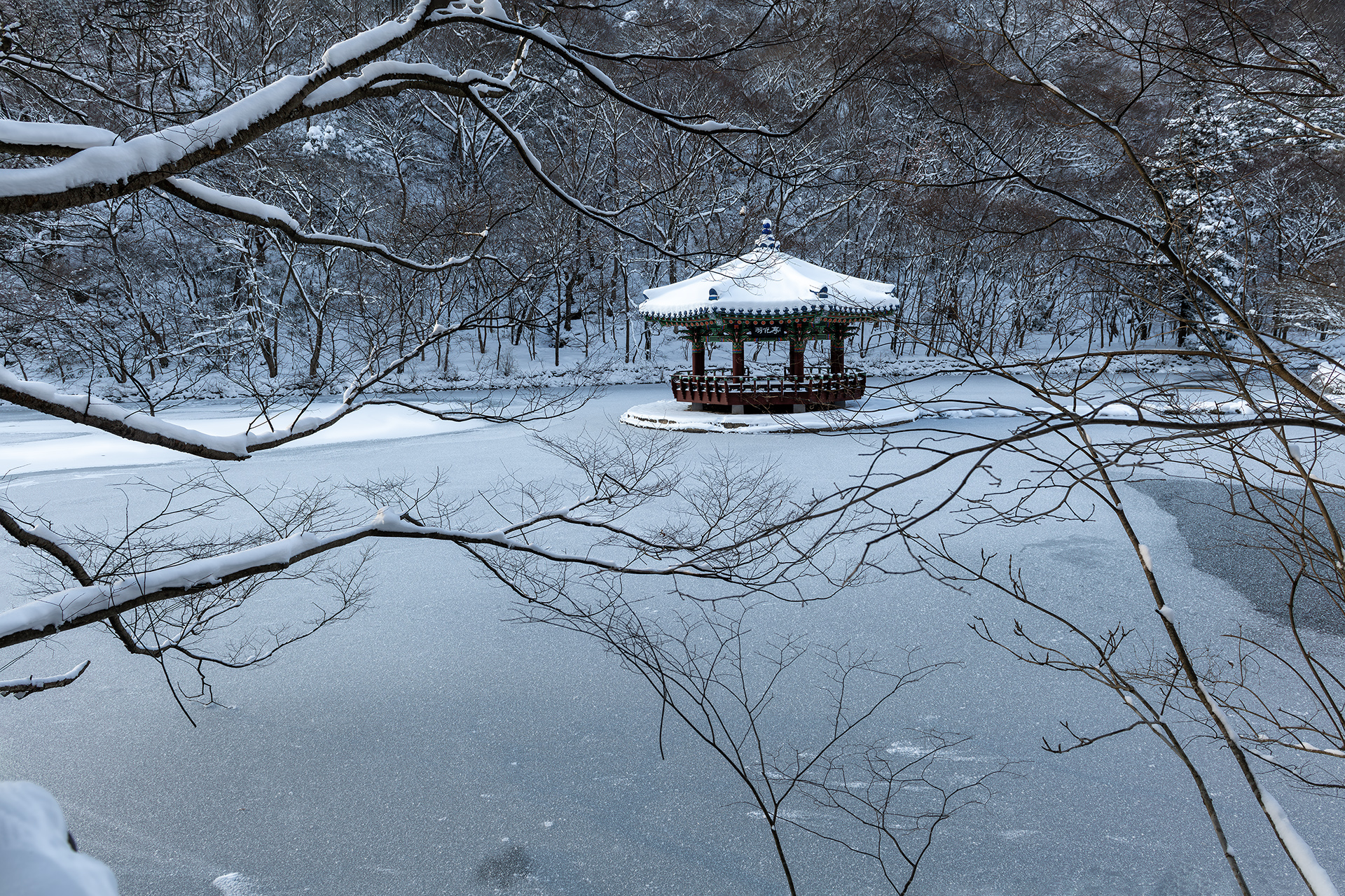 내장사 우화정의 설경.