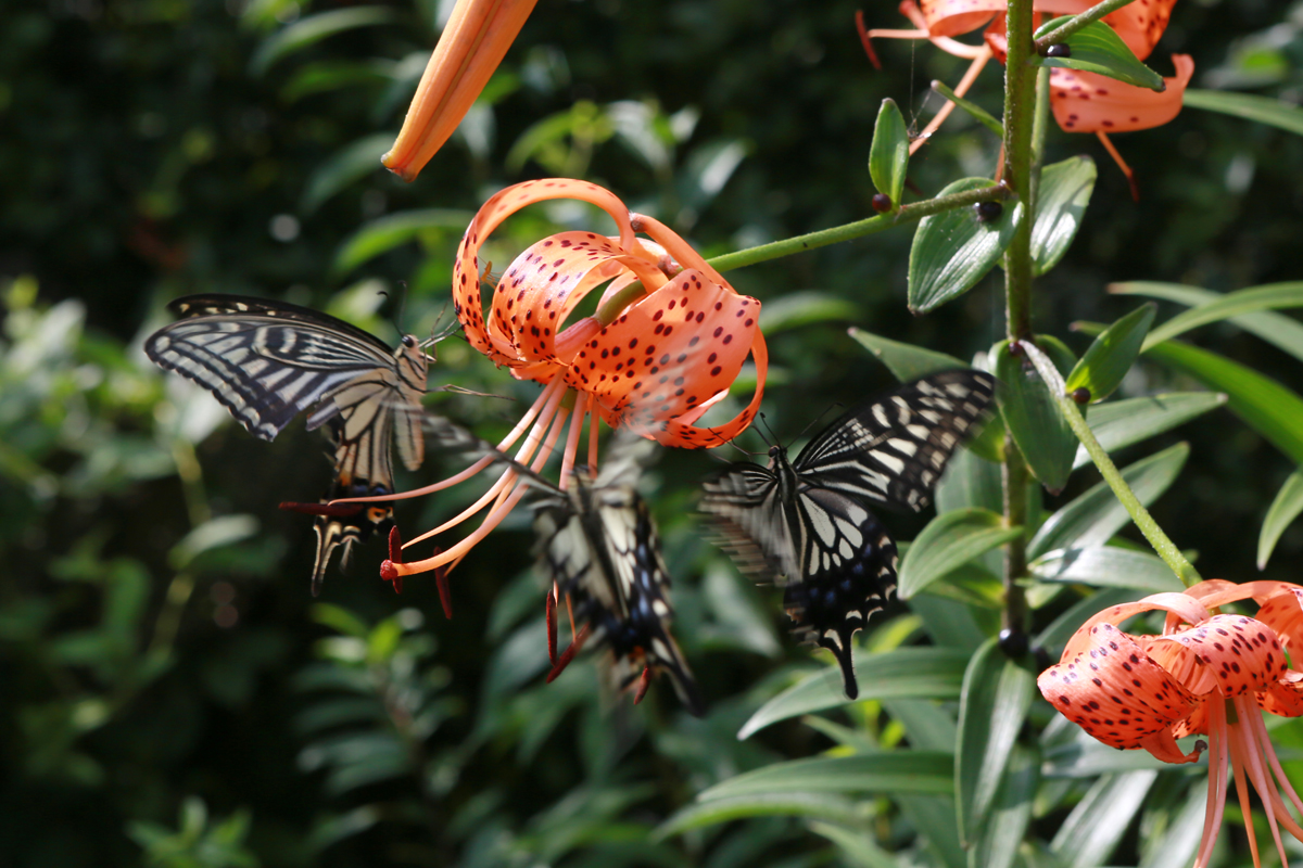 참나리에 앉아 호랑나비와 제비꼬리 나비가