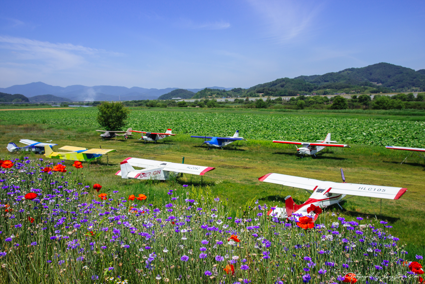 함안둑방 아래 경비행기가 대기중