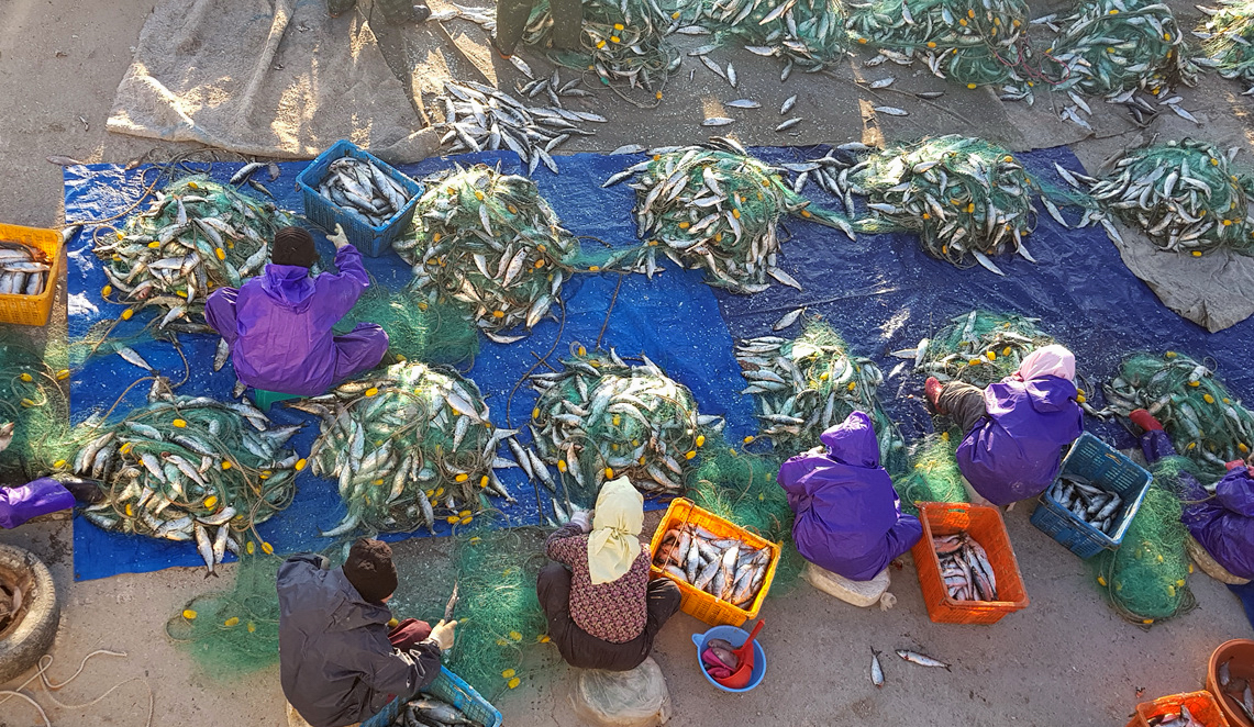 만선의 청어를 그물에서 빼내는 손길이 분주하다