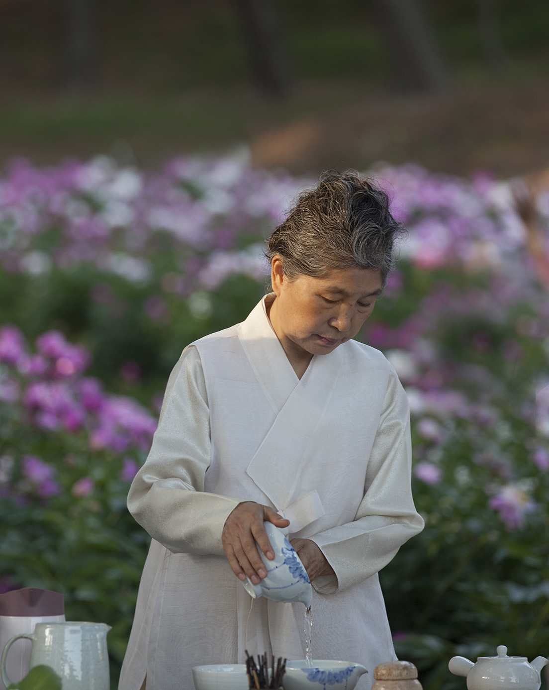 오신손님들을 위하여 일일이 차를 따라서 대접하는