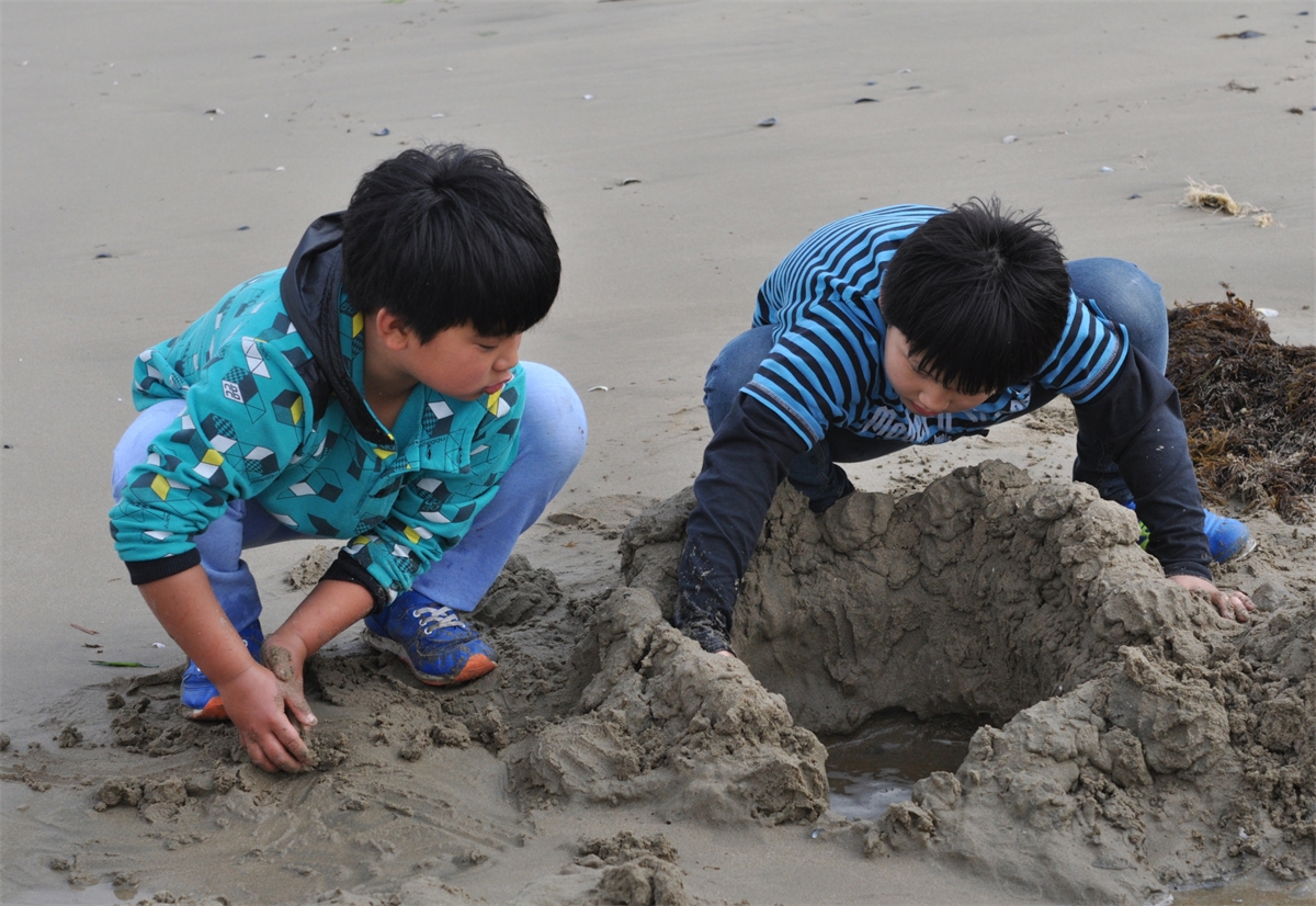 바닷가에서 모래쌓기하며 노는 아이들보며 어린시절 되돌아보다