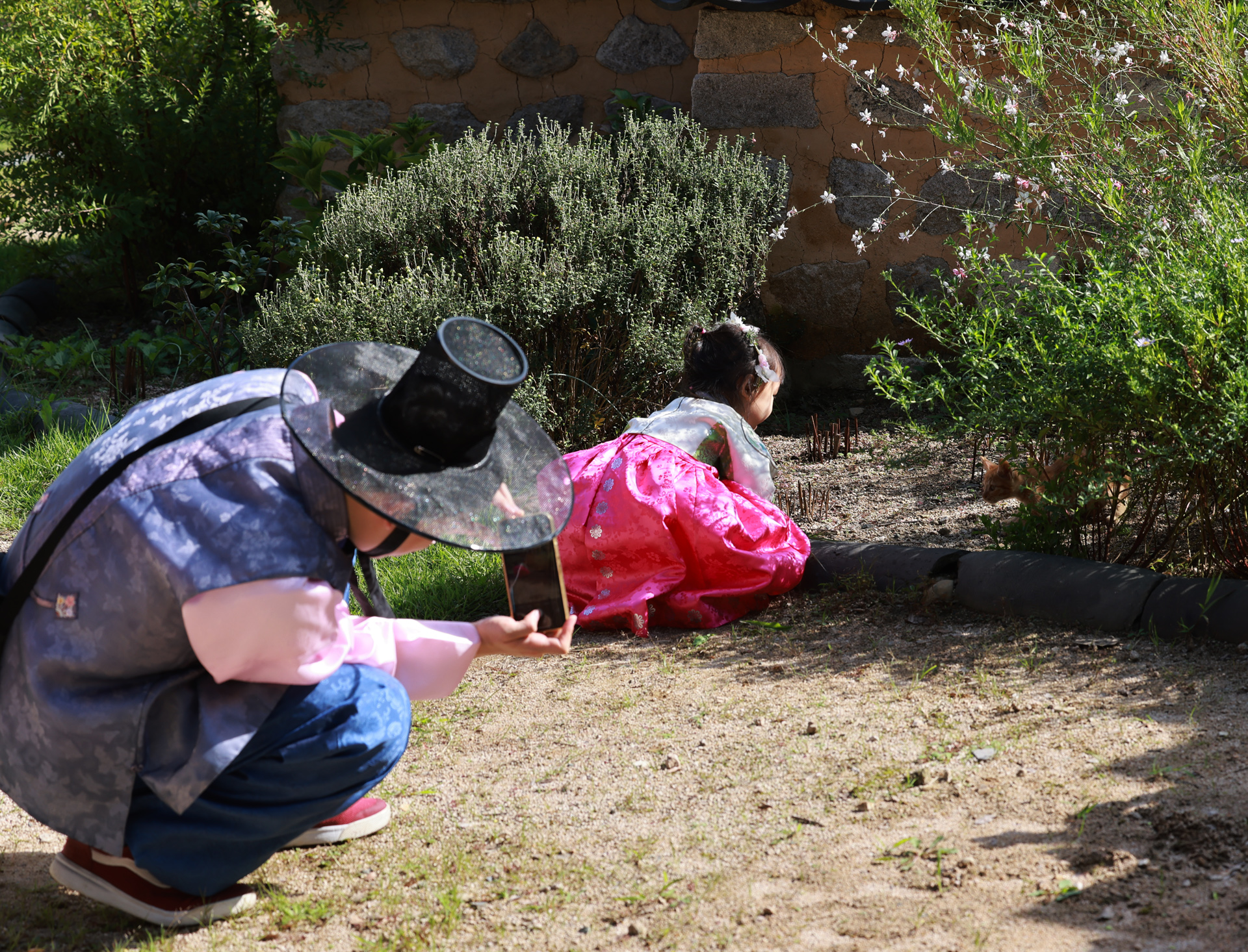 아이는 길고양이를 보고 사랑스러워하고 아빠는 아이를보고 행복해 합디다.