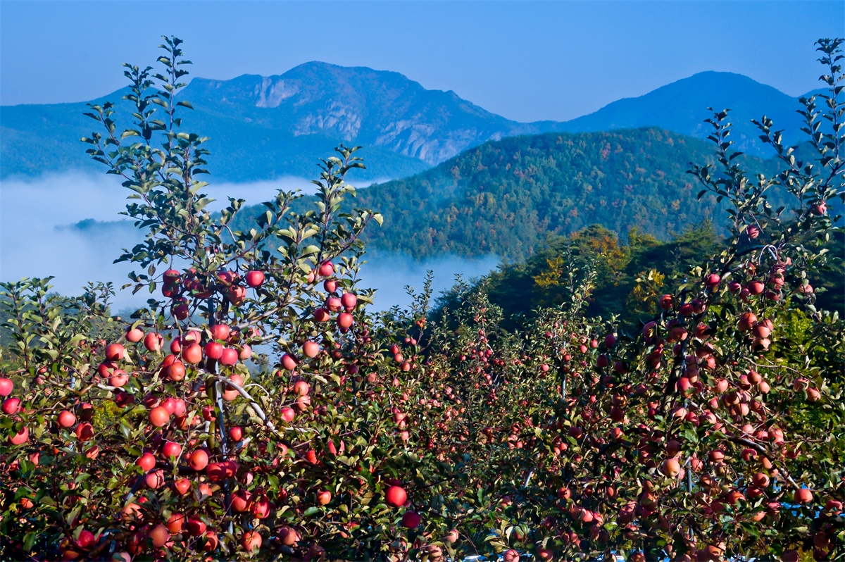 주왕산 초입의 사과와 운해깔린 주왕산