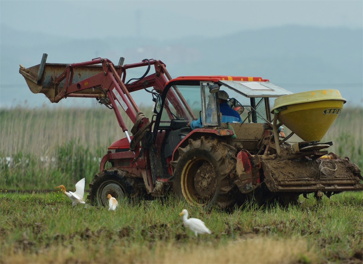 경주 강동뜰에서 모내기 준비작업중인 트랙트와 백로