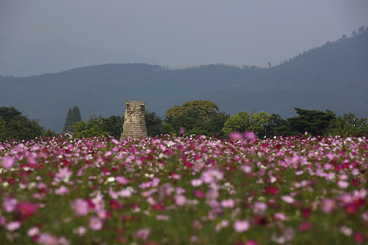 첨성대 옆 꽃단지에서 첨성대를 바라보다.