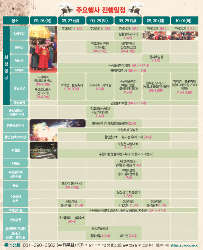 | 주요행사 | * 화성행궁 : 친림과거시험, 진찬연 등 * 행궁광장 : 개막연·불꽃축제, 폐막연·불꽃축제, 국제자매도시의 밤 등 * 연무대(창룡문) : 총체공연(무예종합예술공연), 깃발전, 봉화재현 등 * 만석공원 : 호수음악회·불꽃축제 * 수원화성 일원 : 정조대왕 능행차, 시민퍼레이드 등 * 부대행사 : 짚신신고 수원화성걷기, 수원화성 축성체험 등 * 연계행사 : 생태교통 2013 수원, 음식문화축제, 백수연 등 |