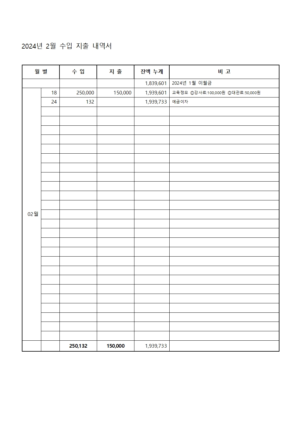 2024년 2월 수입 지출 내역서