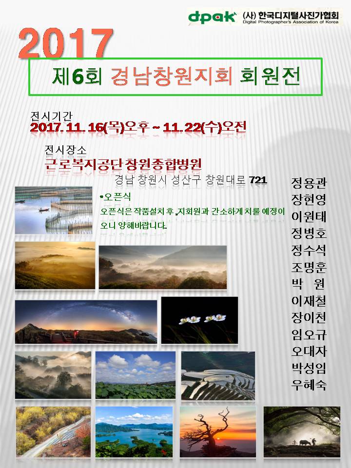 2017년 창원지회 회원들이 카메라와 함께했던 날들을 사진으로 담아 전국 회원님들을 모시고 회원전을 할려고 합니다