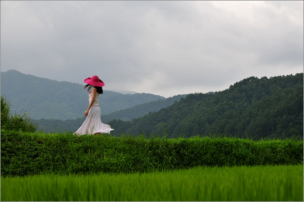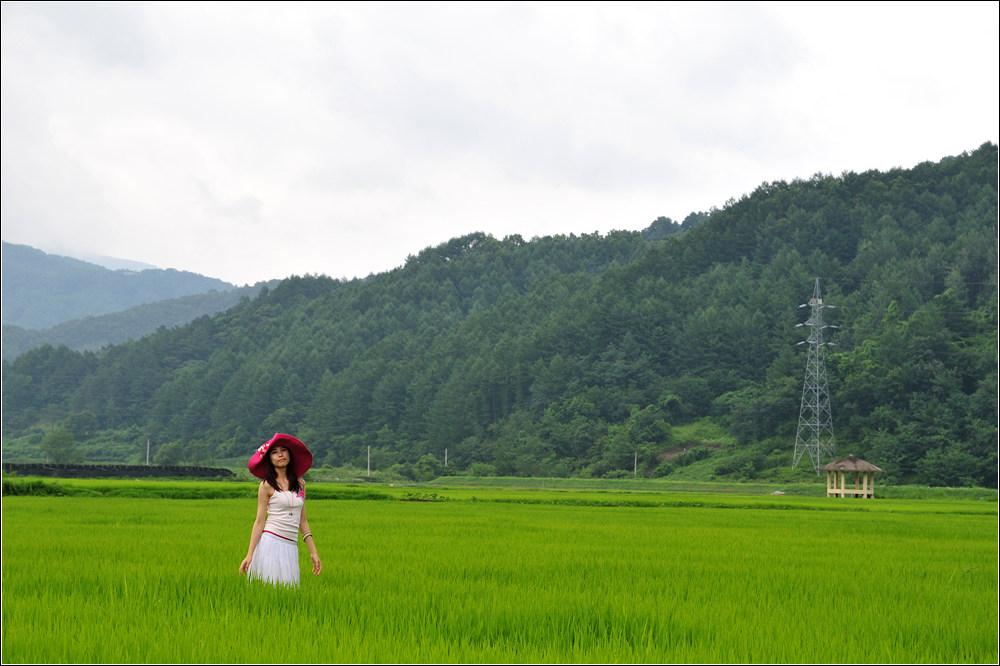 논, 철탑, 경운기, 정자와 여인