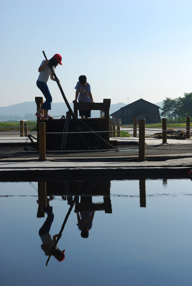 호기심 많은 아이가 물레를 돌려보네요.