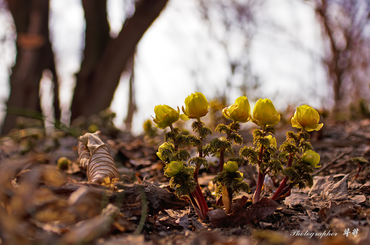 봄볕이 내리는 아침에 복수초가 한들거립니다.