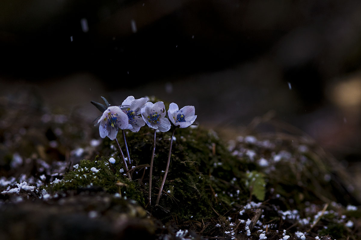 비에 젖은 변산바람꽃의 어깨가 더 무거워졌습니다.