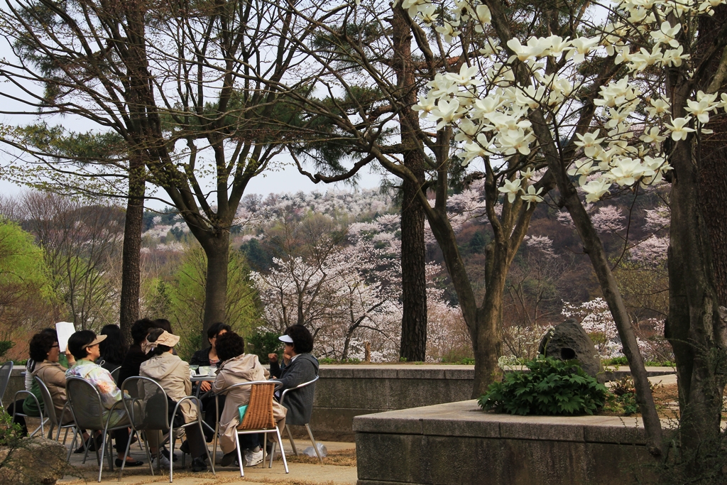 희원에서 아름다운 목련과 꽃들이 동산을 이뤘습니다.