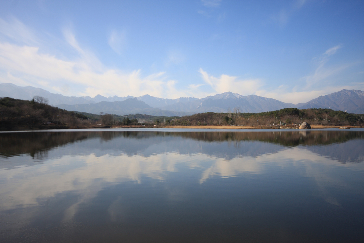 영랑호 맑은 물에 반영된 황철봉과 푸른 하늘