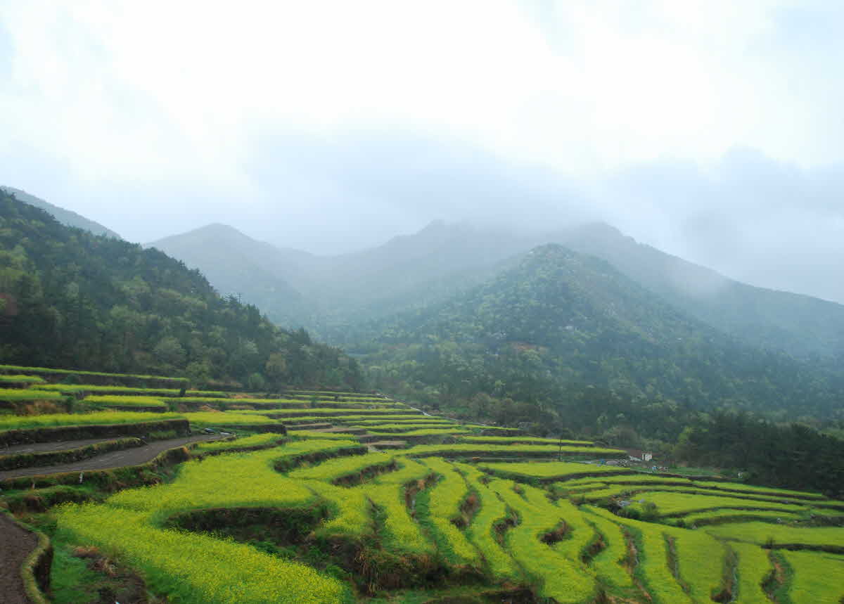 비가 와서 산도 밭도 하늘도 젖어있는 다랭이 유채밭입니다.
