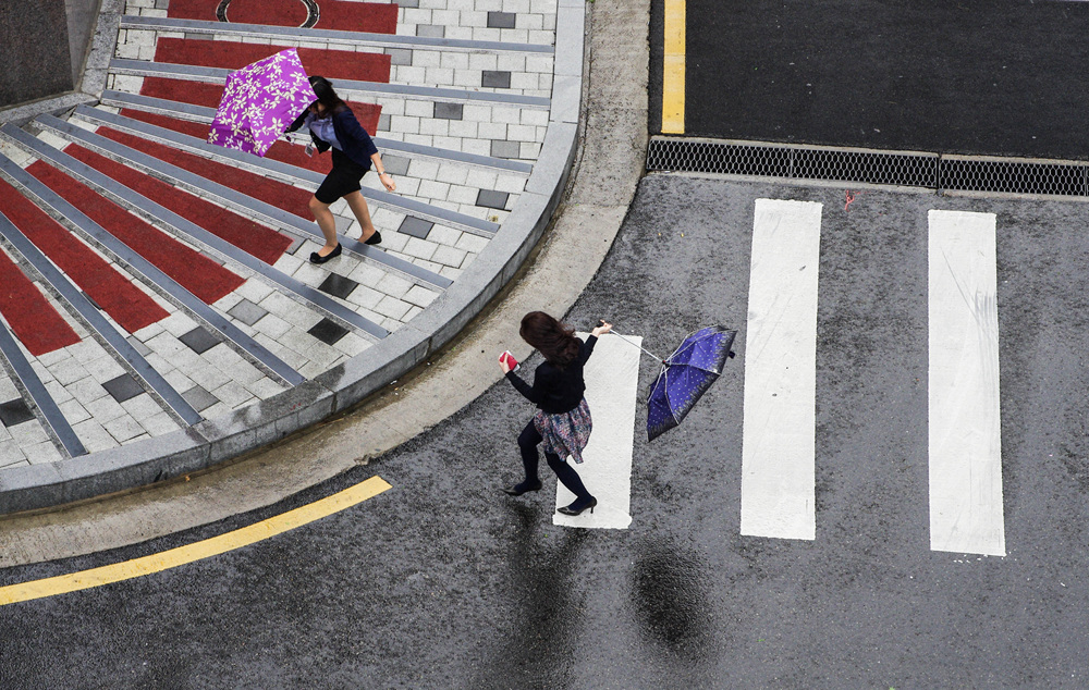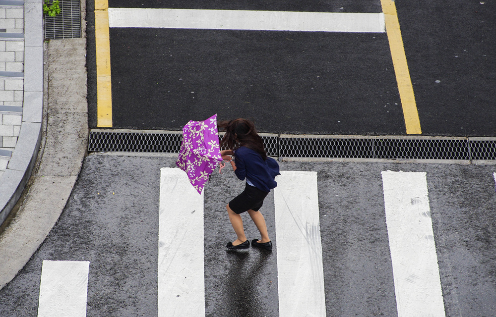 빨간 작은우산을 쓰고 비바람과 씨름하는 모습 발견..