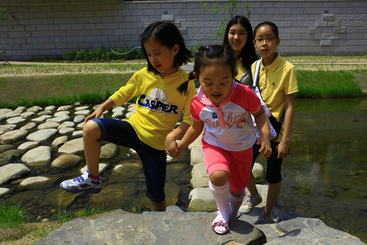 엄마와 세딸들이 서로가 도움을 주면서 징검다리를 건너와 성공이다빠지지안고 무사히 건넜다...기뻐하는 모습