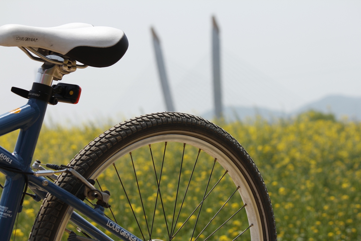 내 애마와 유채밭 뒤에 백석교가 보인다