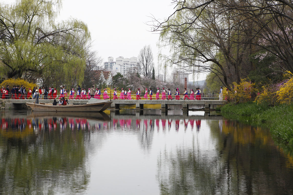 한복을 곱게 갈어입고 줄지어 다리를 건너는모습이 아름다웠읍니다,