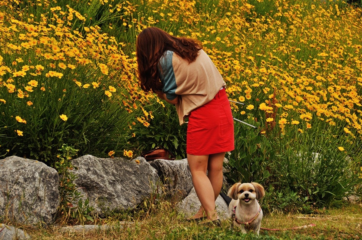 꽃 사진을 담고 있는 아가씨와 애견