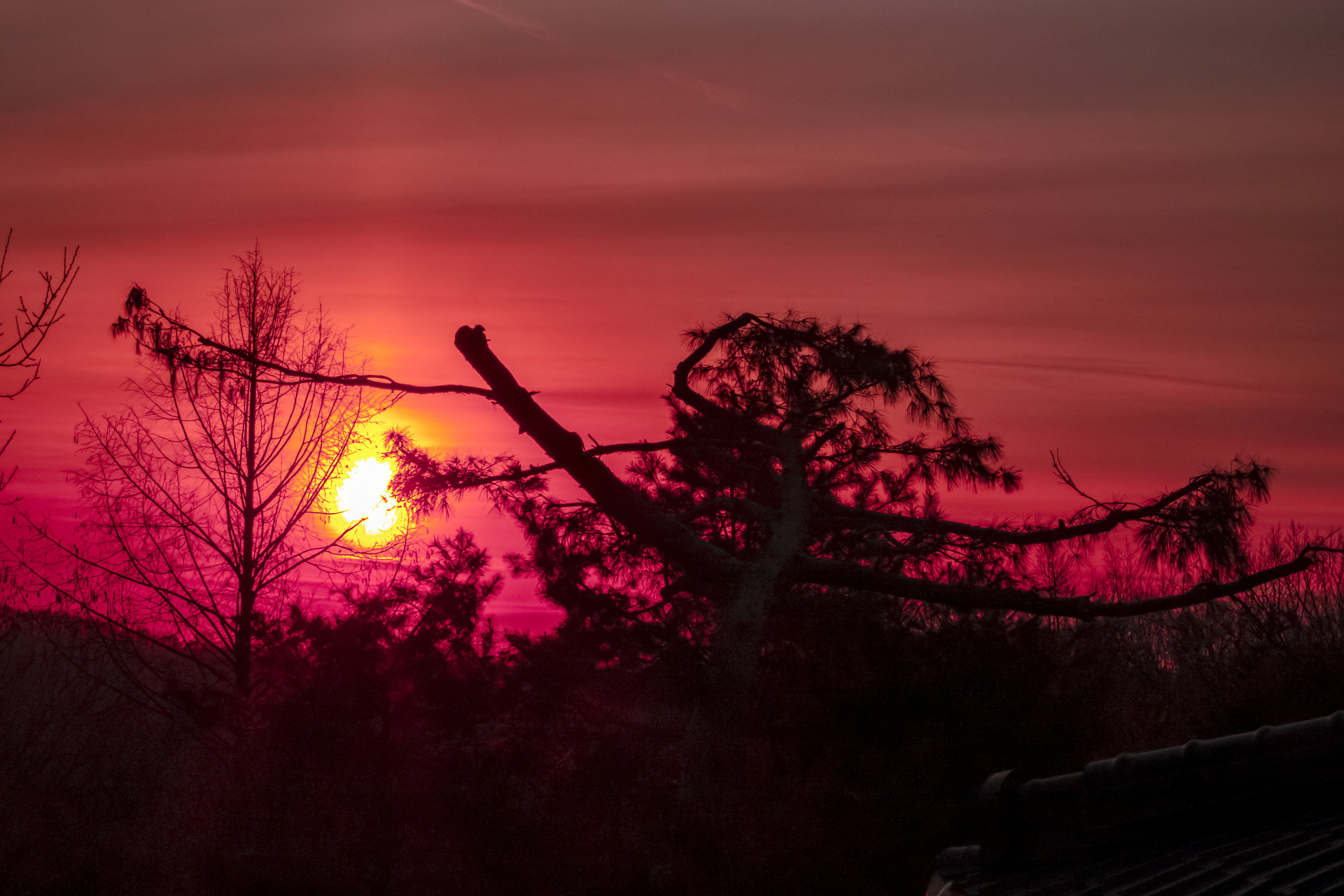 새해 아침 수리산에서 나무들 사이로 일출