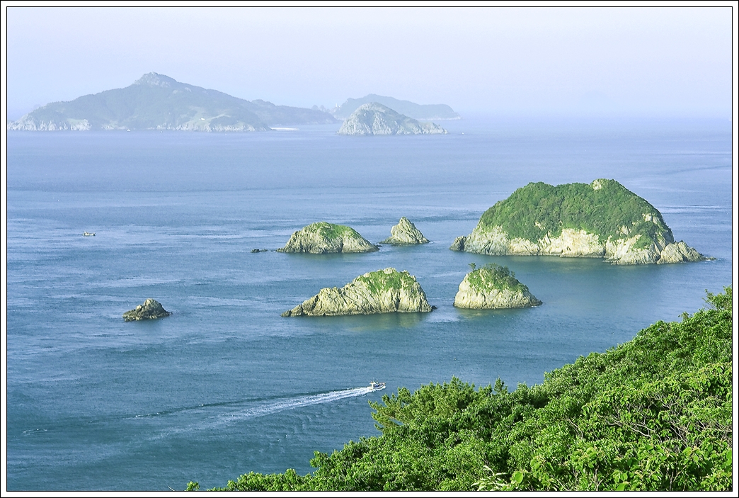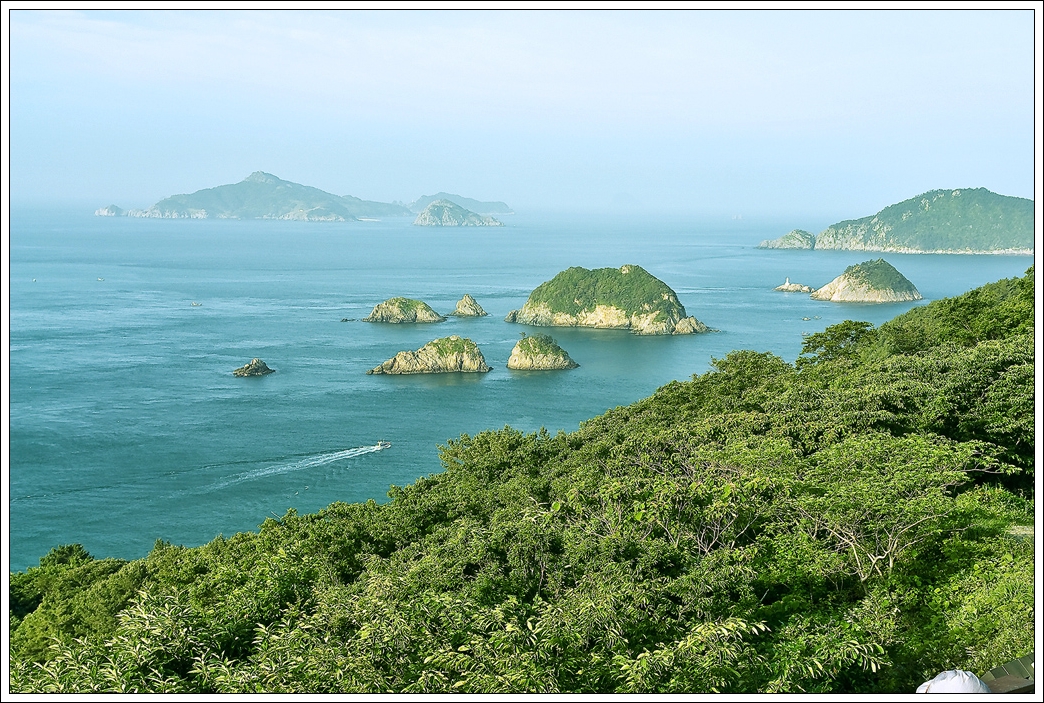 거제 홍포전망대에서 바라본 아름다운 소.대병대도의 모습 입니다. 멀리 좌측으로 희미하게 보이는 섬이 매물도 입니다. 가물가물 안개속의 매물도의 모습이 신비롭게 보입니다.