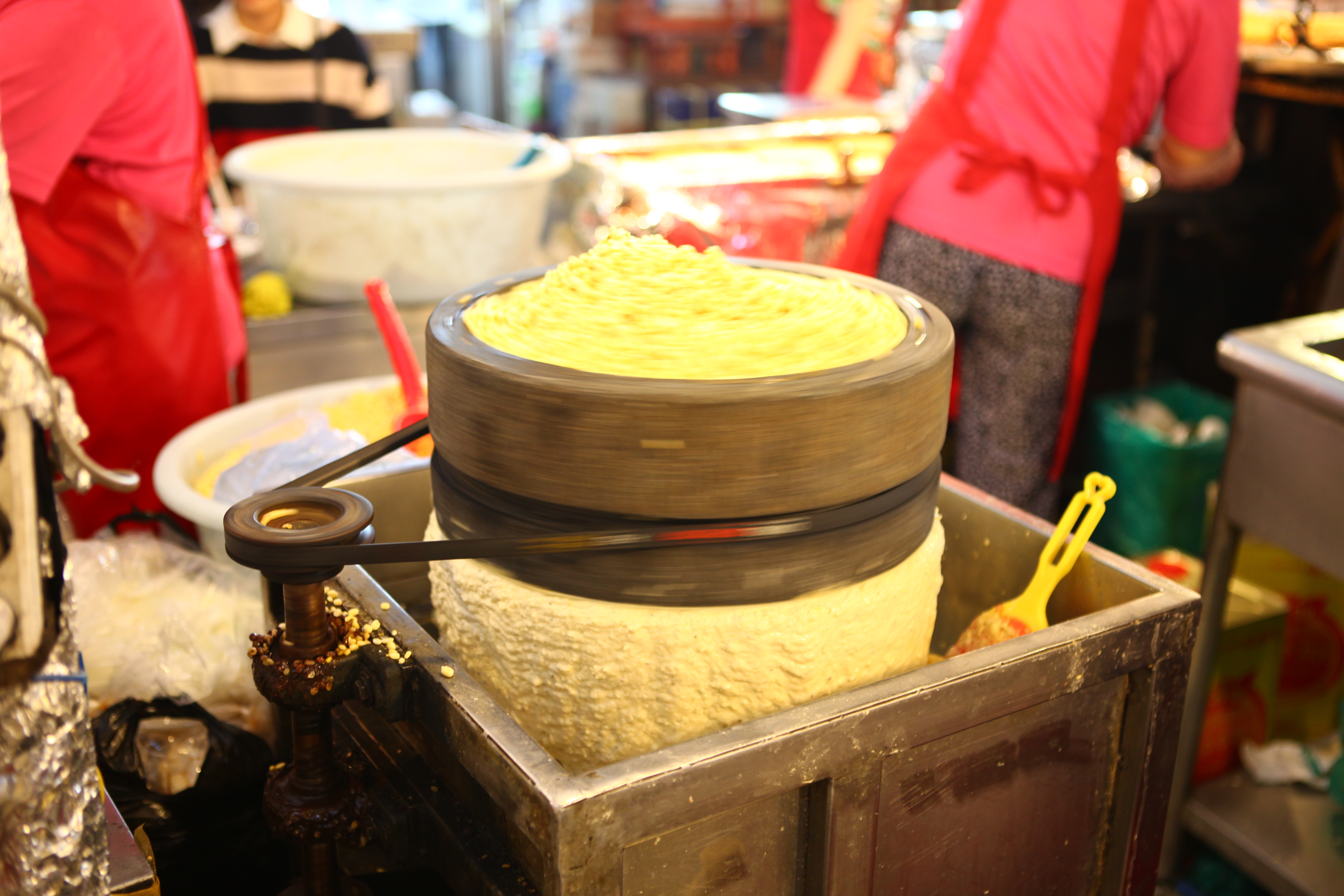 광장시장에서 많은 인파 속에서 부지런히 돌고있는 맷돌