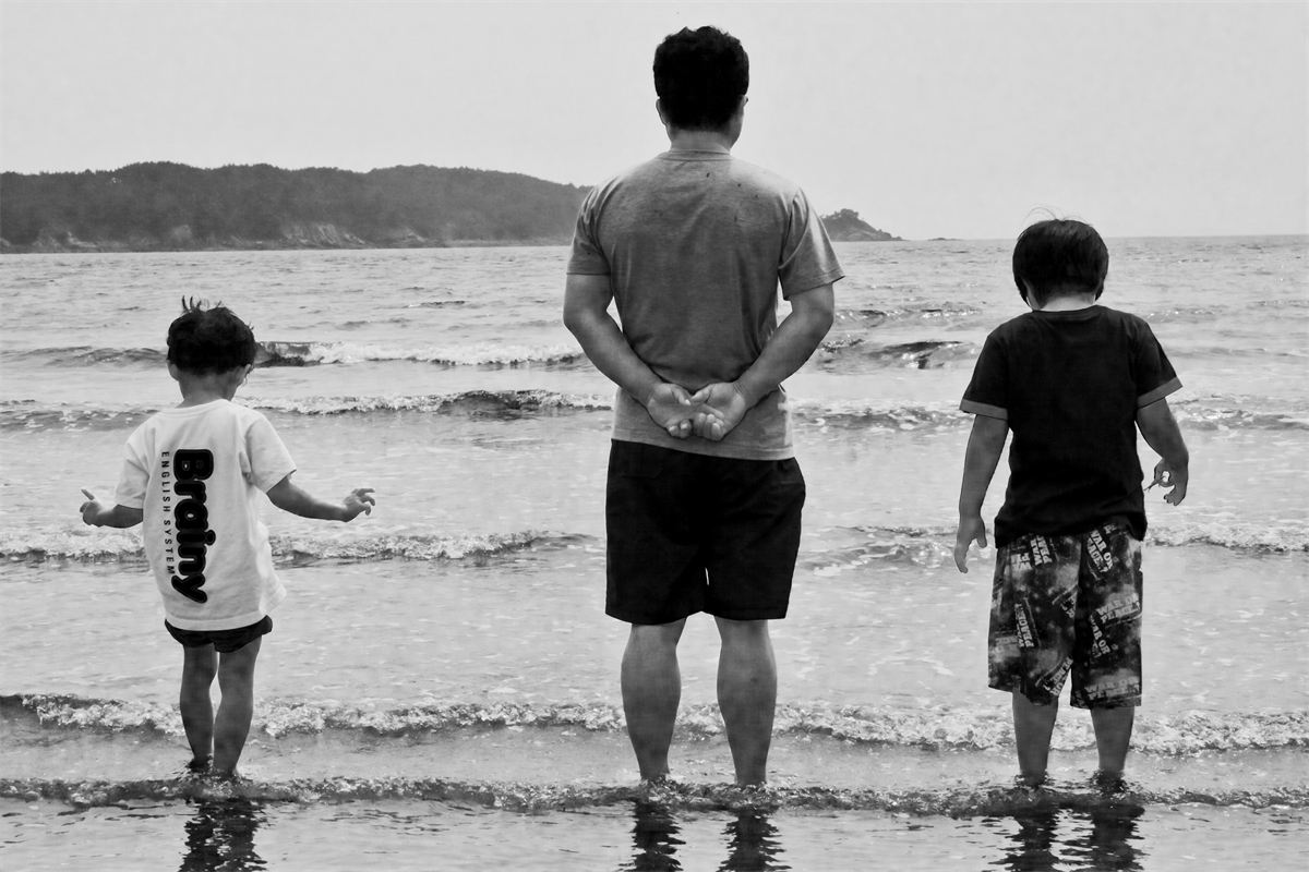 수평선을 보며 사색하는 아빠와 파도의 일렁임에 관심을 둔 두 아들의 시선이 재미있게 보입니다. 참고로 촬영후 허락을 받았고 사진도 보냈습니다.