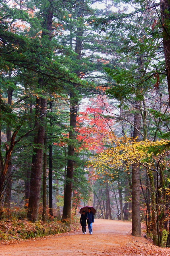 늦가을 이슬비 속에 전나무숲길에서 행복한 동행