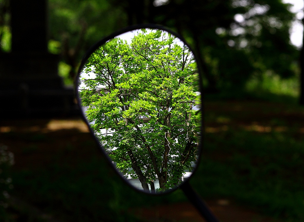 우연히 오토바이 백미러에 땀을 닦으려고 다가갔다가 반영으로 비친 나무를 찍었습니다