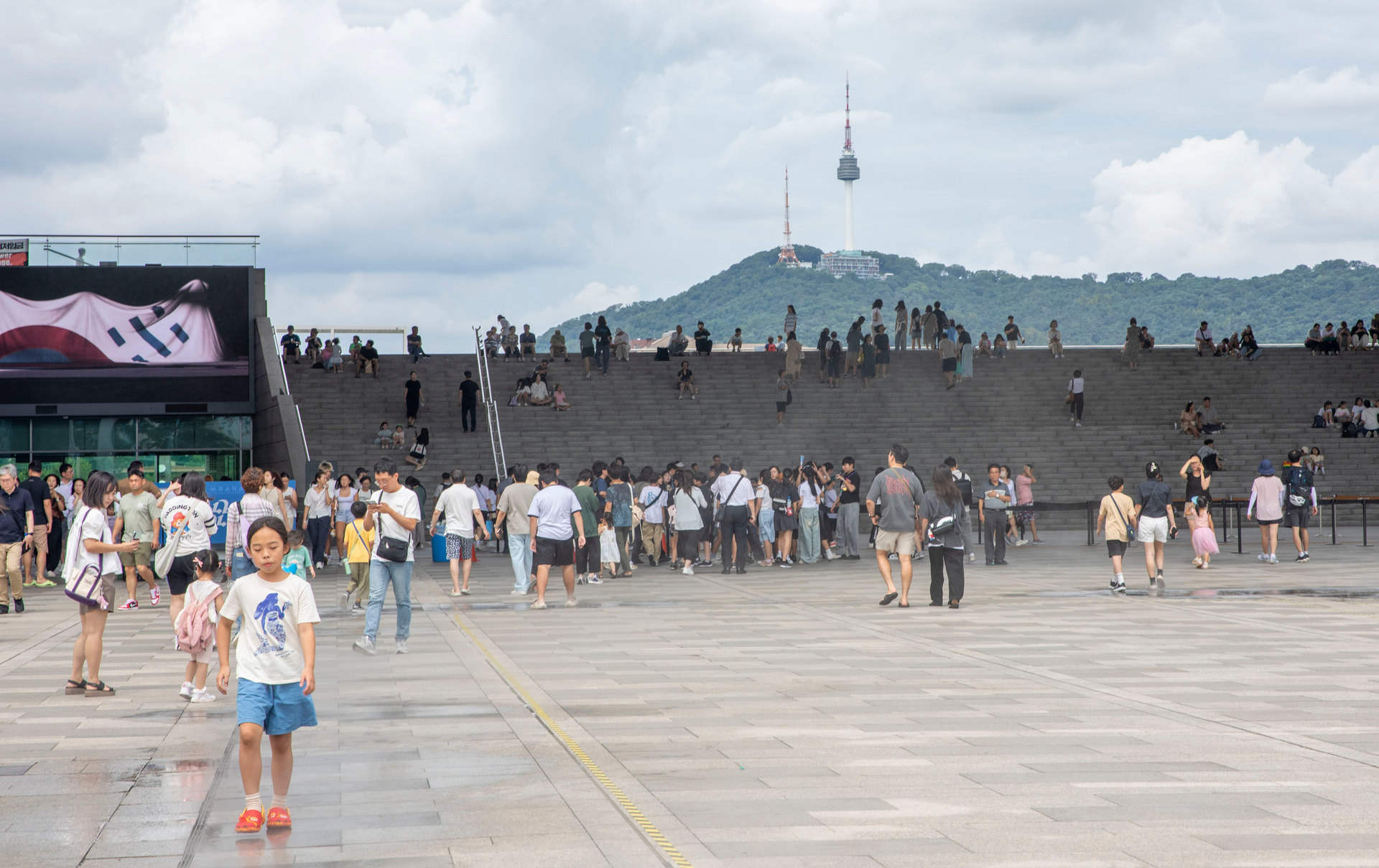 더위 속에서 분주한 사람들과 휴식을 취하는 사람들의