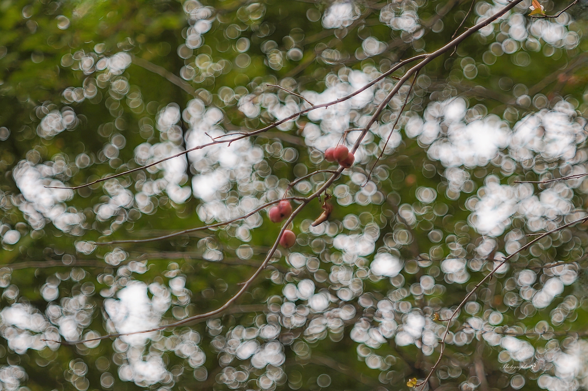 꽃 사과 앙상한 가지에 미련을 두고 매달려 있지만 머지 안아 땅에 모두 떨어져 거름이 되리라.