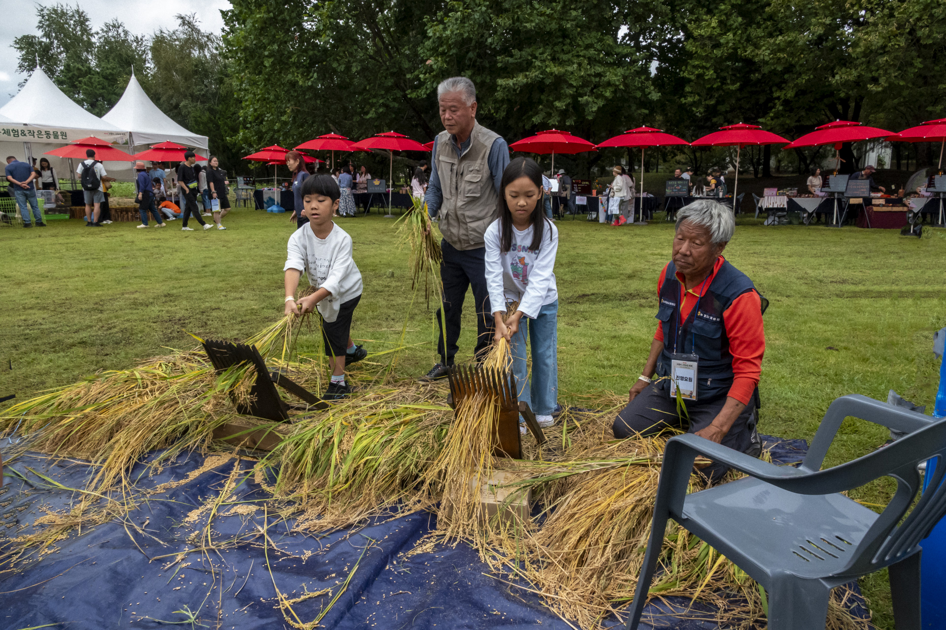 옛날 농기구 홀태로 벼 훑어내는 체험