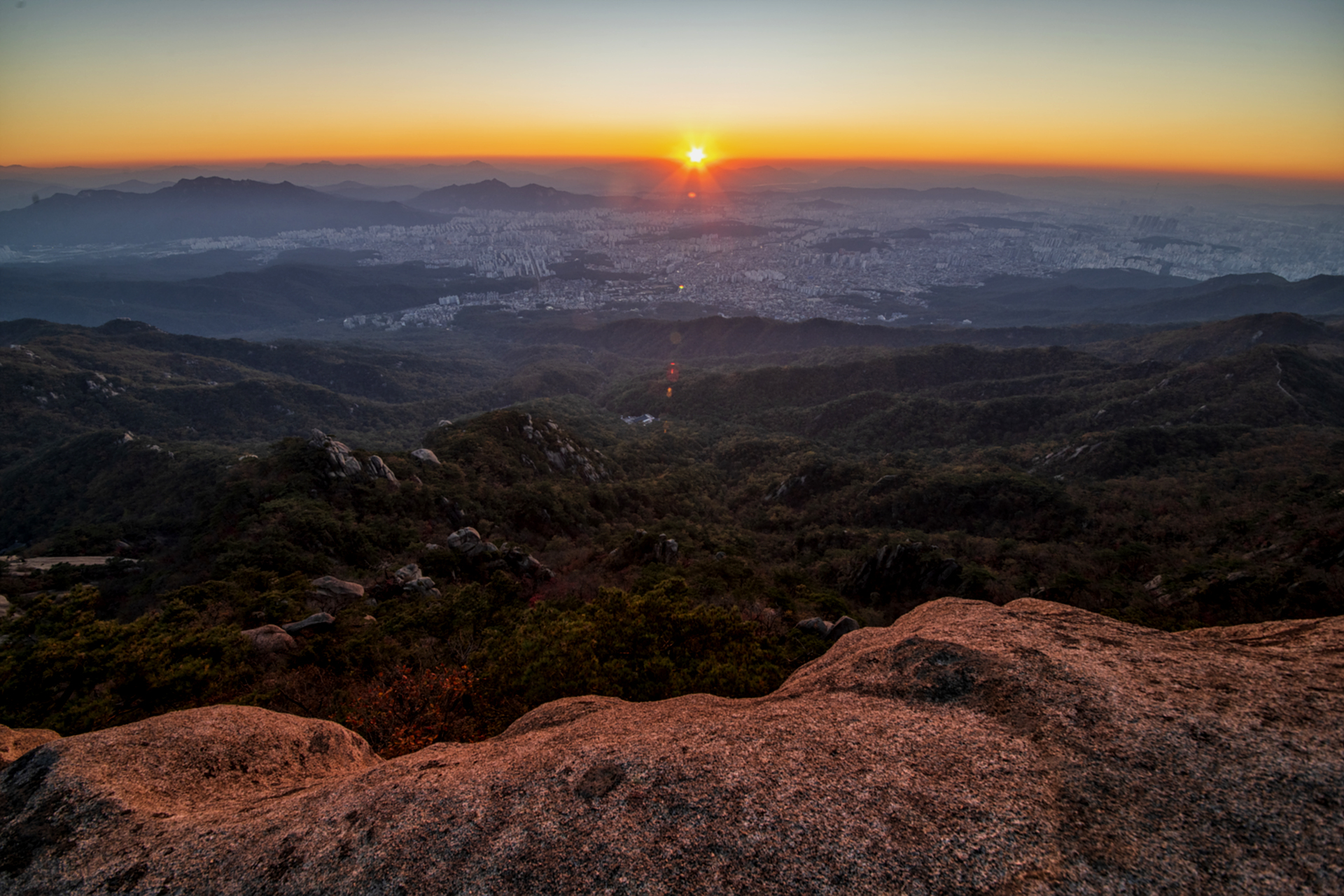 지평선 위로 솟아오른 태양을 바라보며 자연의 웅장함과 인간 도시의 작은 존재감을 느끼게 되네요..