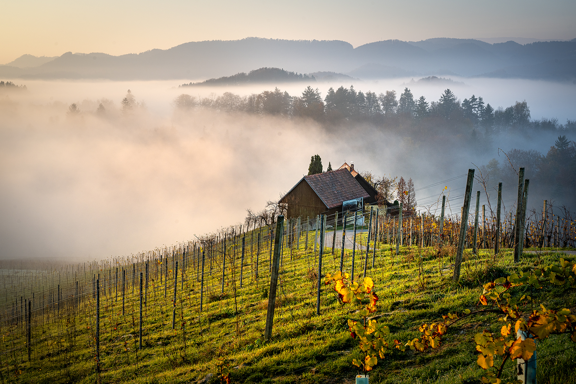 슬로베니아와 오스트리아 국경마을의 포도밭에 아름다운 아침이 밝아온다
