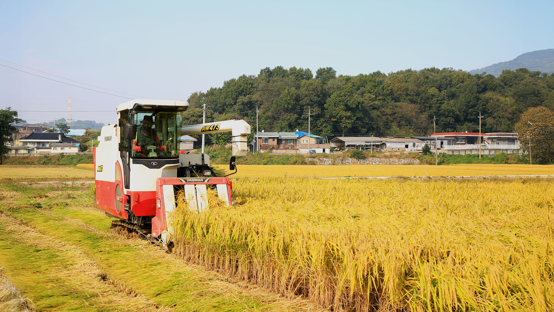 콤바이로 벼을 추수하는 모습