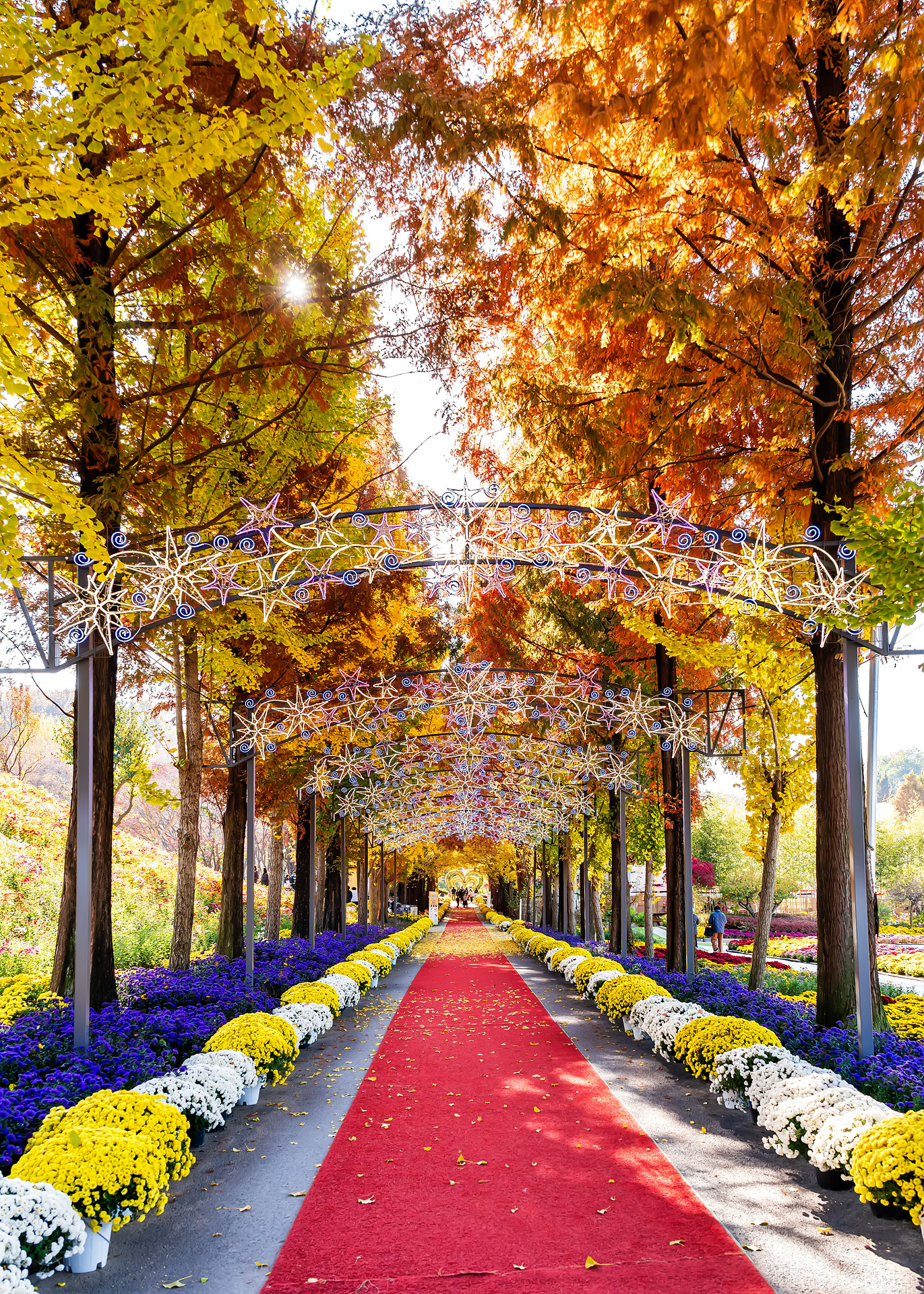 붉은 카펫이 깔린 길로 단풍을 바라봅니다.