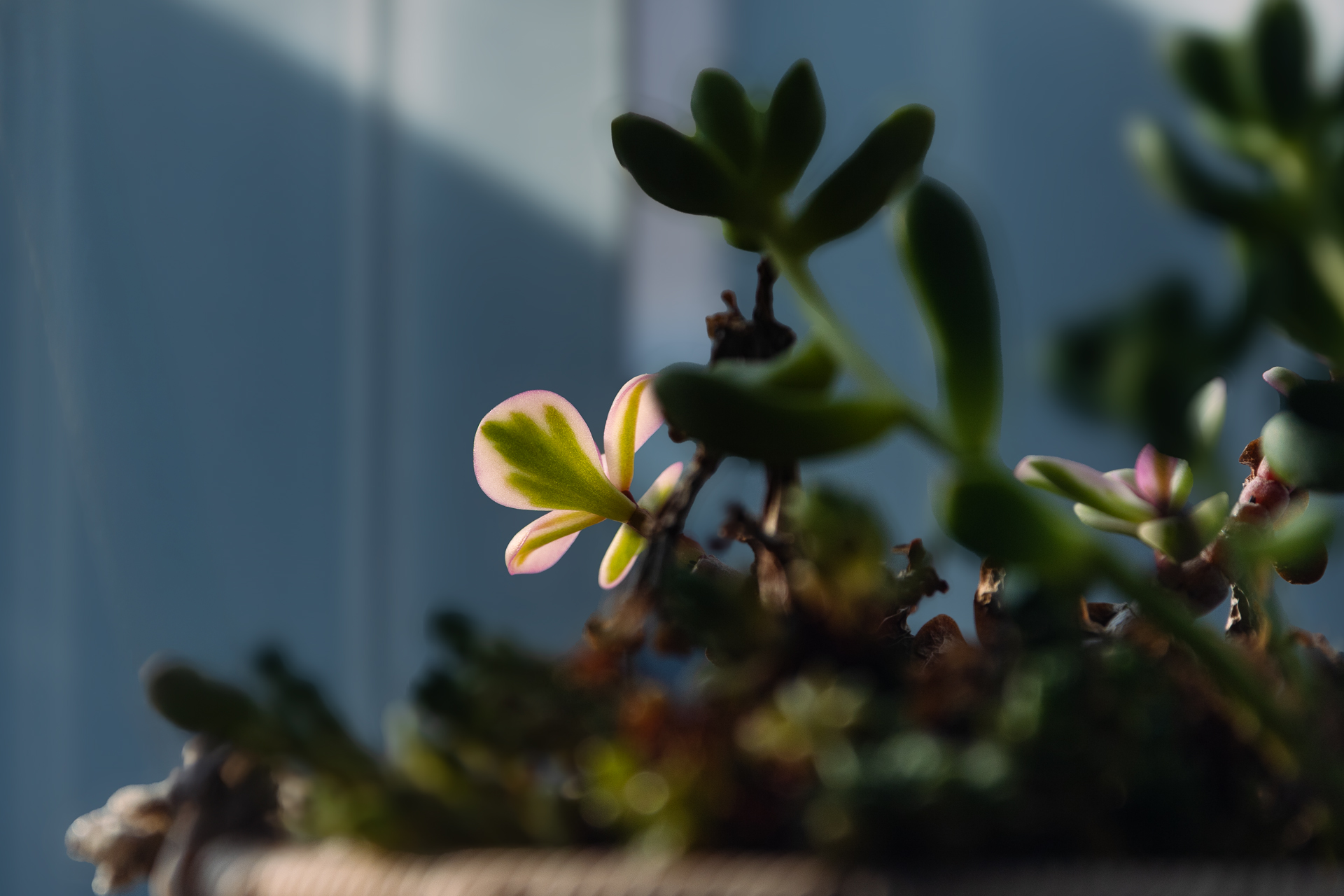 창틈으로 한줄기 빛이 다육이 잎에 머문 순간을 담아 봅니다