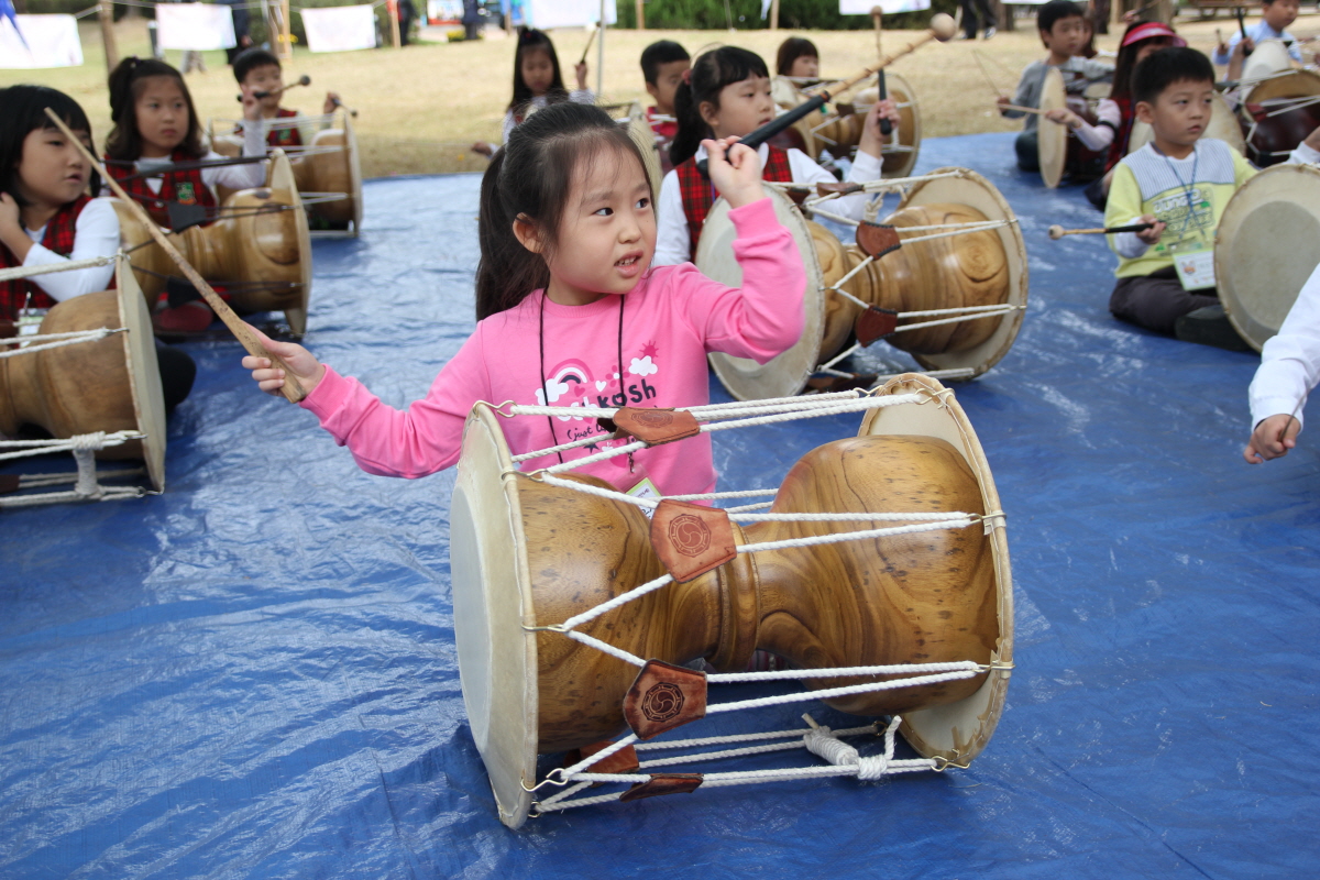 천안 흥타령 축제장에서 장구를 배우고 있는 어린이