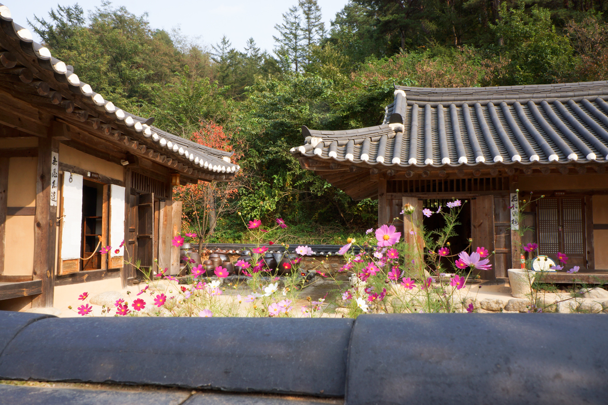 담너머 안뜰에 다소곳한 코스모스를 살짝 엿보며