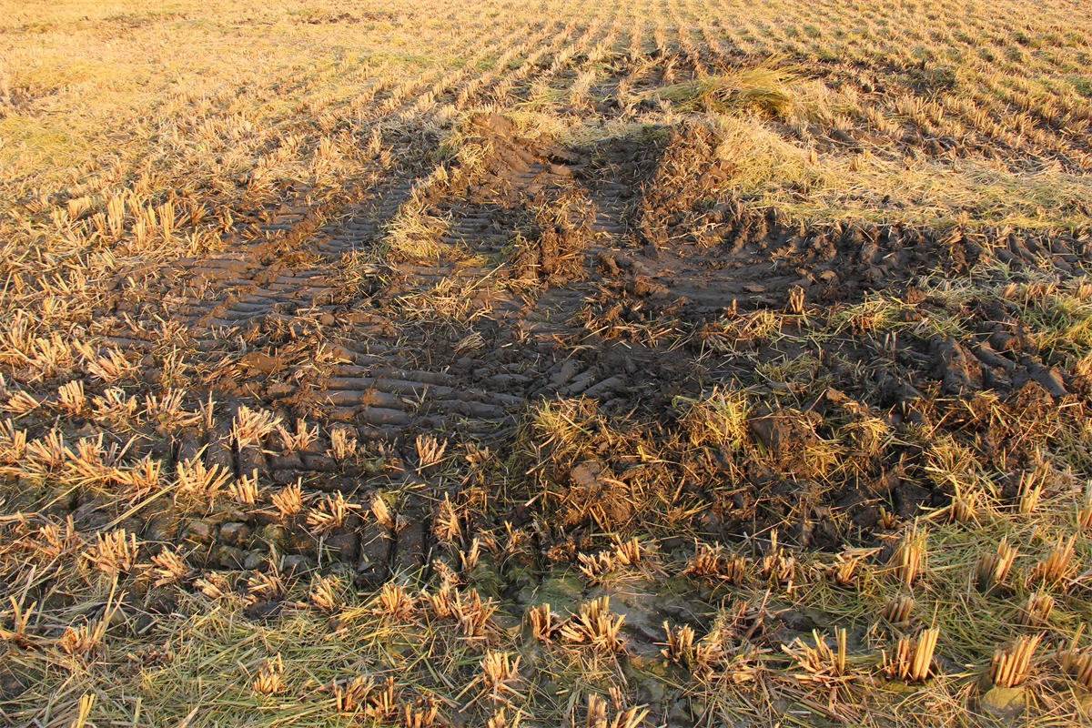 벼베기 트렉터가 짓이겨 놓은 깊은 자국들이 보였습니다.