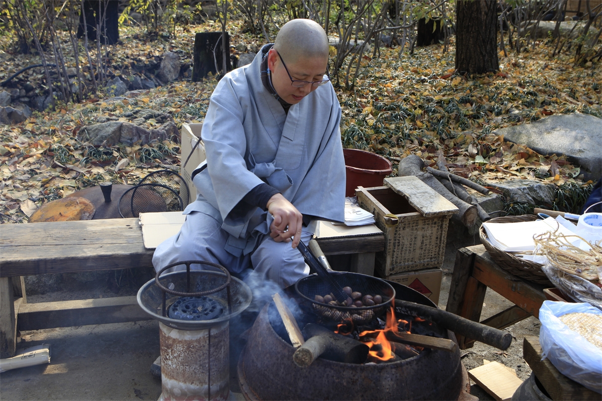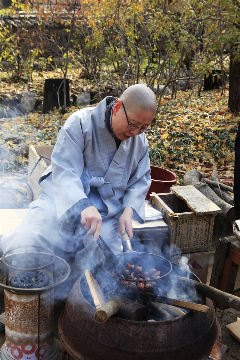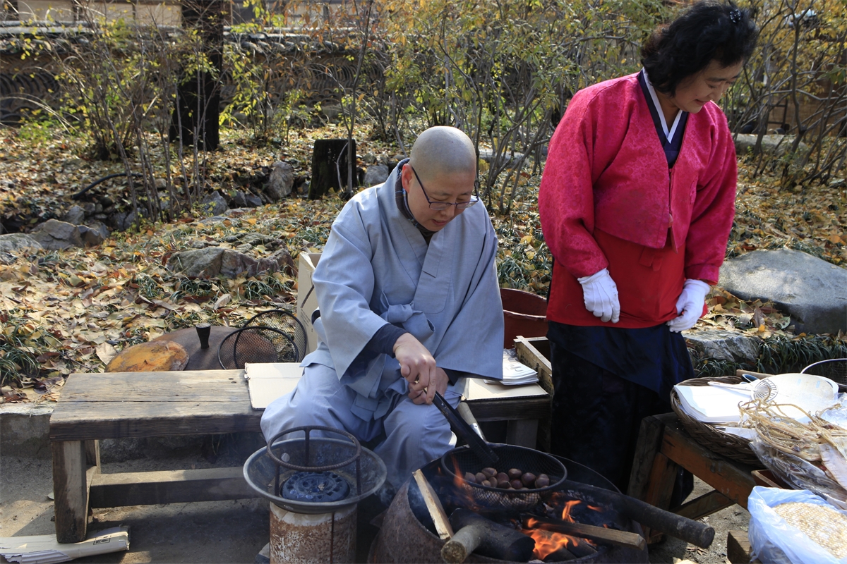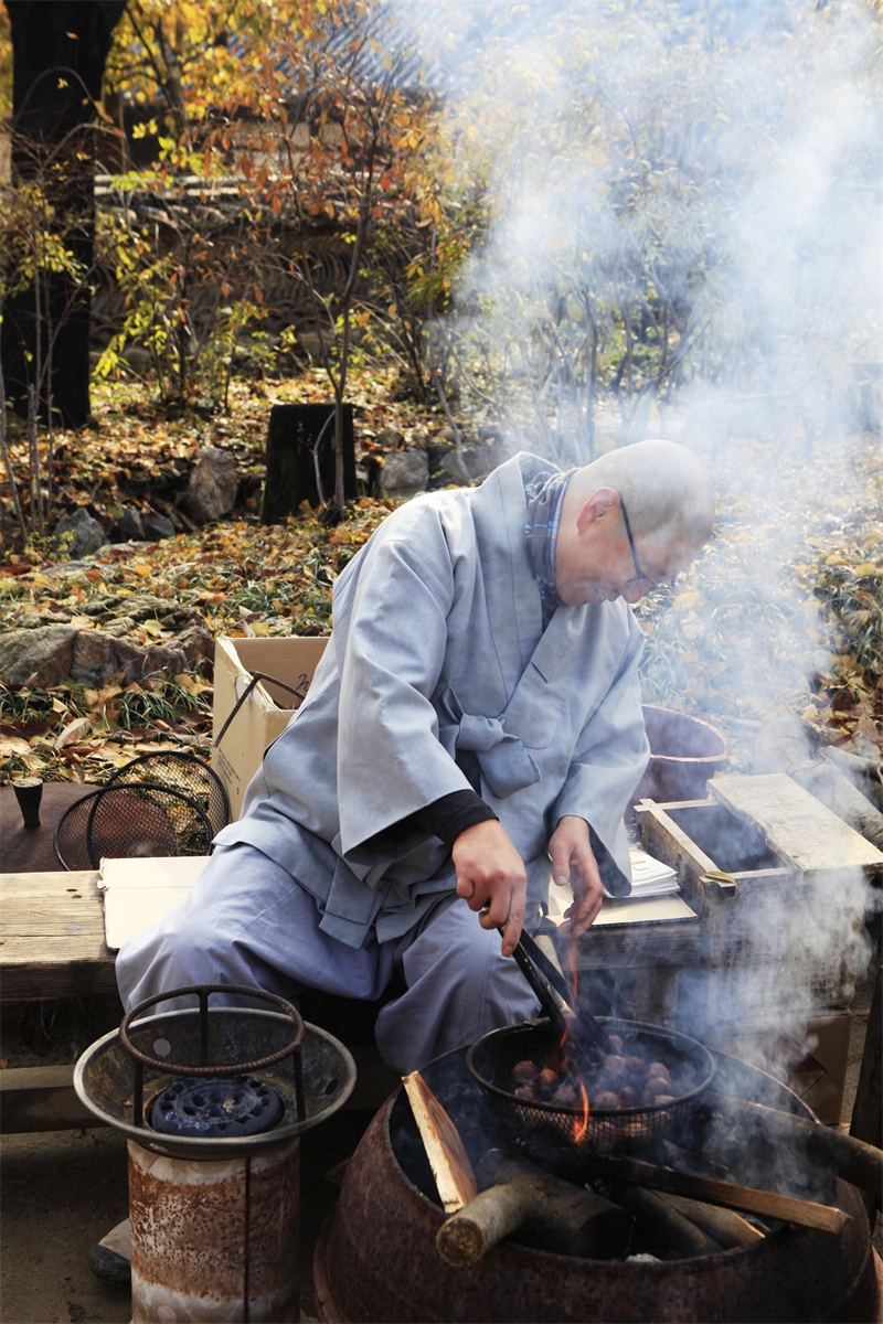 연기에 눈이 매워도 밤구워파는 아낙을 도와주는 스님의 불심