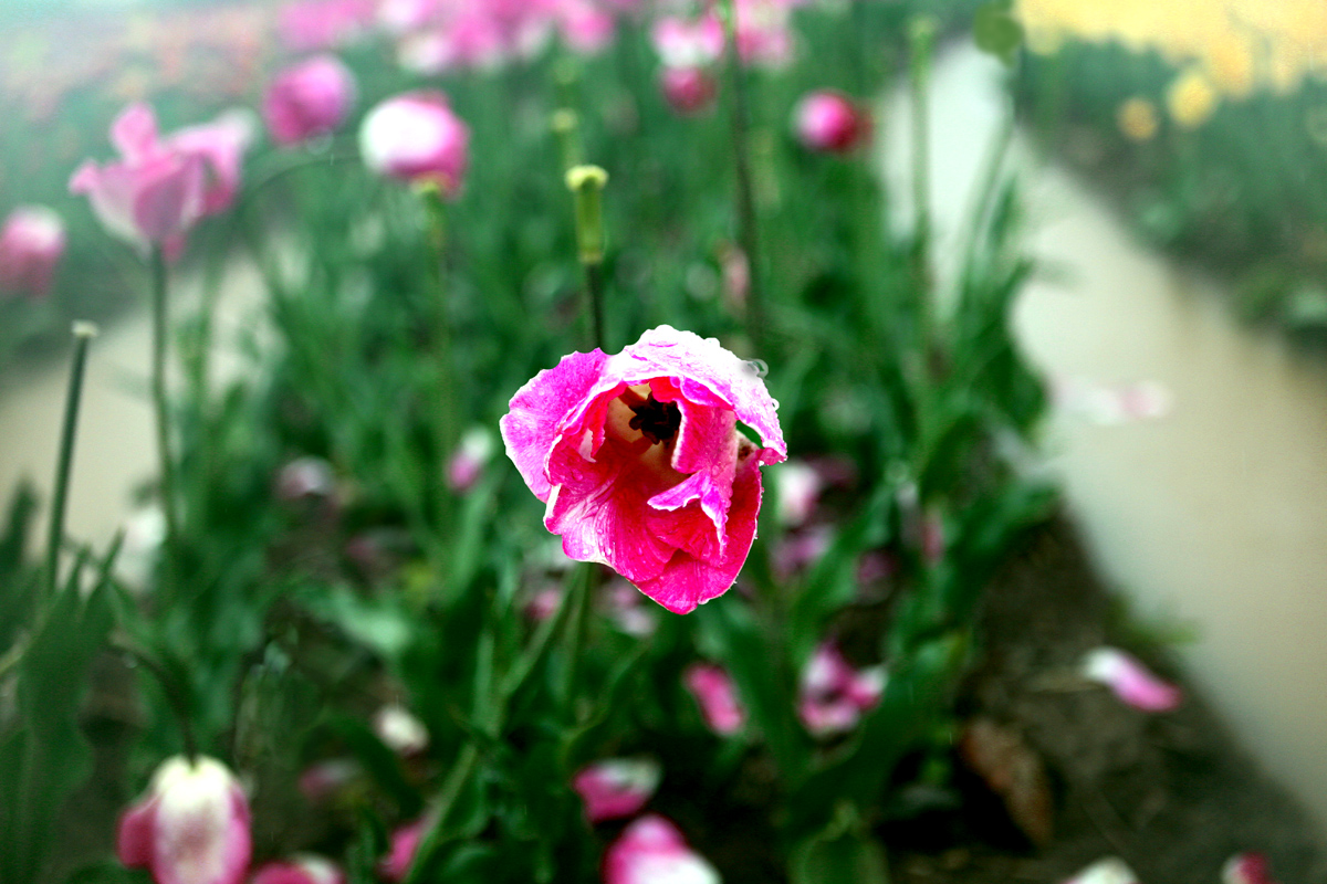 장마비에 꽃밭은 물에잠기고 튤립 한송이만......