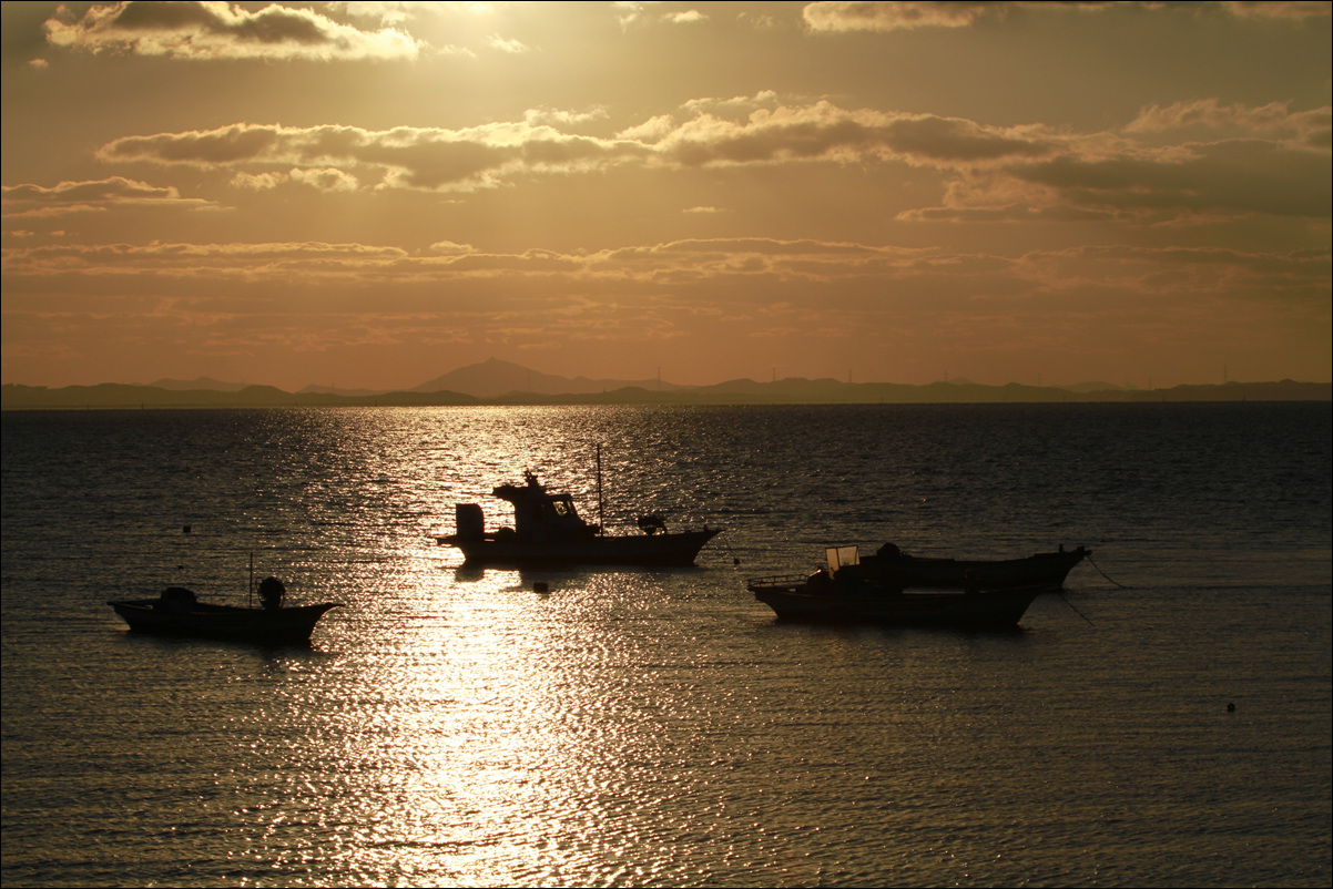 붉은 노을빛에 밀물도 황금색으로 바래졌습니다.